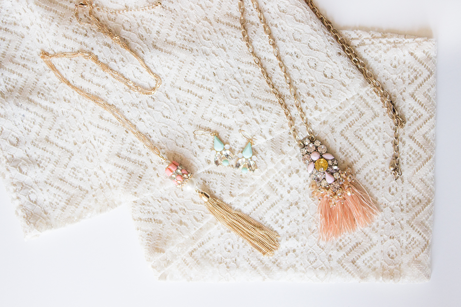 So this necklace is probably the furthest from my comfort zone. I do love the statement pendant and long gold chain, and the peachy pink colors in this are definitely frequented in my wardrobe. The only thing I'm a little unsure of is the fringe. It's not something I would usually gravitate toward. Perhaps I'll have to pair this with a white top as suggested and see what I think of it. Lately I've found that funky pieces have the ability to grow on me over time, so I don't want to write this off just yet.